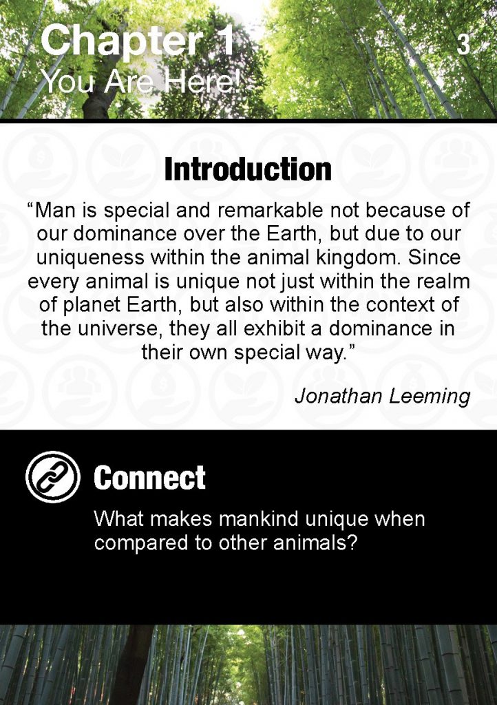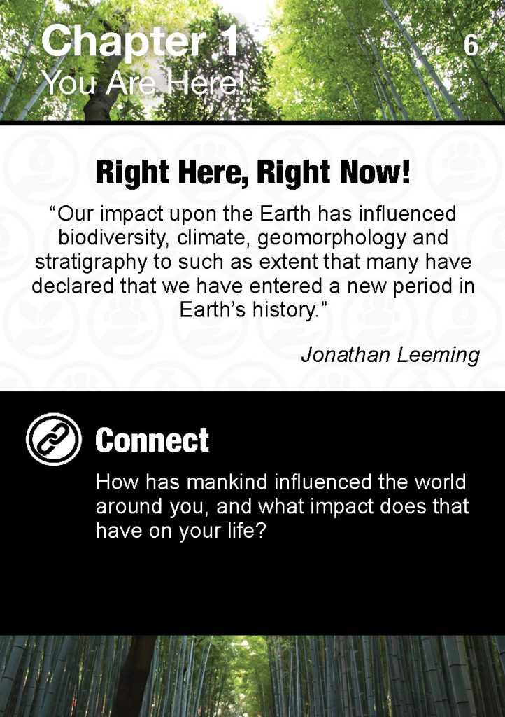 One World Conversations is a simple but thought provoking exercise that gets people talking about sustainability. All you need is a facilitator and group of people. There are 10 cards for Chapter 1 - Right Here, Right Now! that gets the conversation going! 10 Inspiring quotes from One World, 10 ways to connect people to sustainability, 10 ways to create the future.